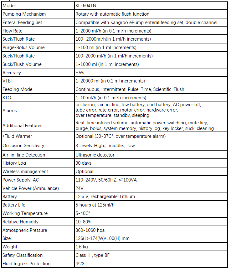 Specificaton for Kangaroo Tube Feeding Pump Nutrition Feeding Pump with Kangroo Consumables KL-5041N